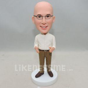 Khaki pants, white dress shirt that is tucked in, with sleeves rolled halfway up forearm, no tie. Glasses are wire-rimmed and oval.